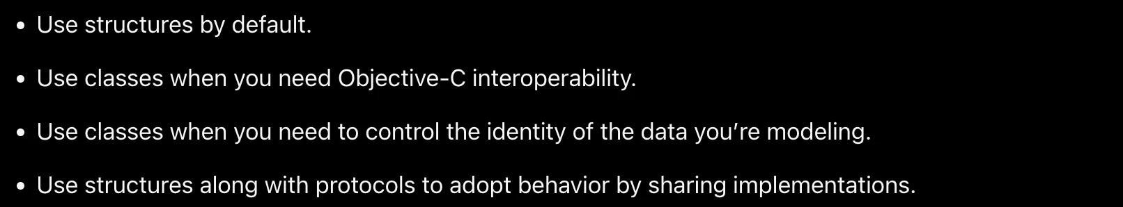 스위프트에서 추천하는 struct와 class에서 고민할때 가이드라인이다.