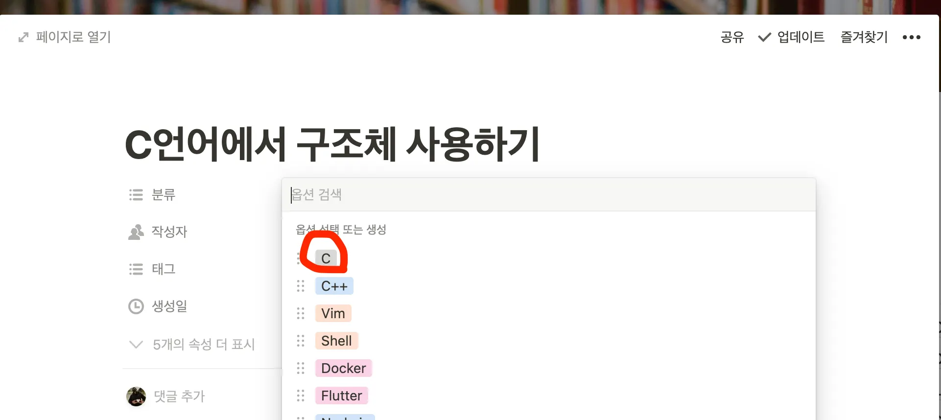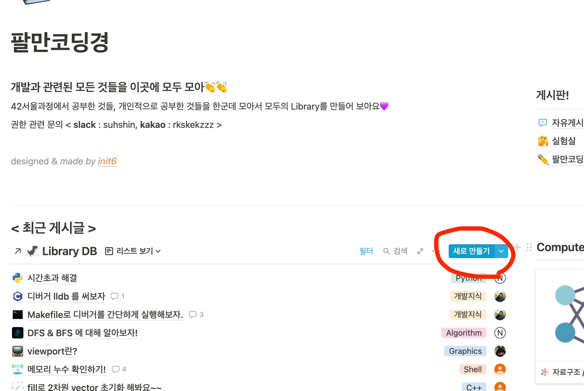 현재 위치하고 있던 페이지가 어디든 상관없이( C를 쓰고싶은데 Docker에 현재 위치하고 있다던가) 노션 DB우측 상단의 파란색 새로 만들기를 클릭합니다!