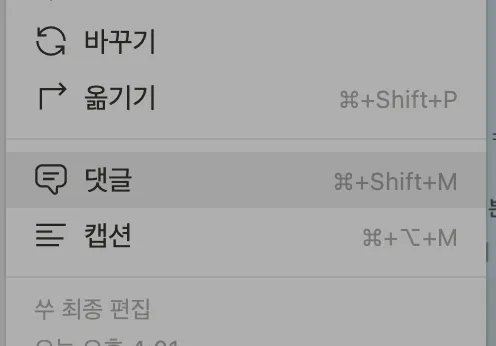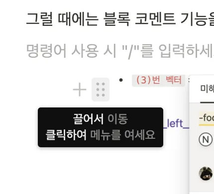 코멘트를 원하는 블록 옆의 점6개 버튼을 누른다. 혹은 단축키 command + shift + M