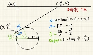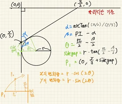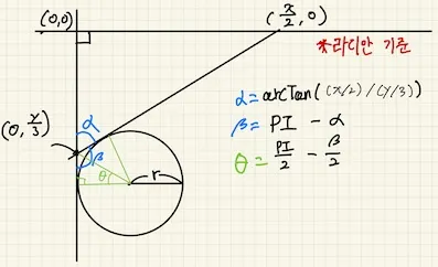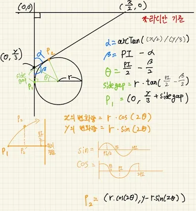 우선 y축과 접하는 점의 위치부터 알아야 한다. (시계방향으로 선을 그리고 있기에)Container 좌측 중단의 점과 상단의 가운데 점의 위치를 알고 있으므로,각도 베타를 구할 수 있다.