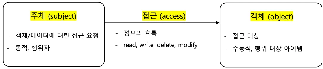 간단하게 프로세스 또는 사용자를 주체(Subject) 라고 생각하면 되고, 객체(Object)는 자원, 정보와 같은 파일이나 폴더라고 생각하면 됩니다.