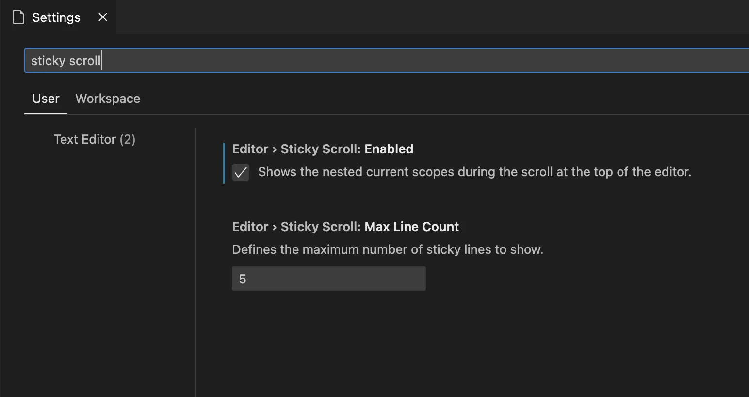 Editor > Sticky Scroll: Enabled 설정을 체크하면 됩니다.