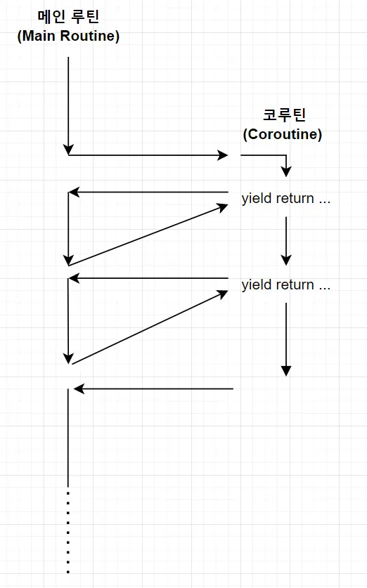 yield return 명령문을 만나면 메인루틴에게 흐름을 돌려주고 다시 흐름을 돌려받습니다.