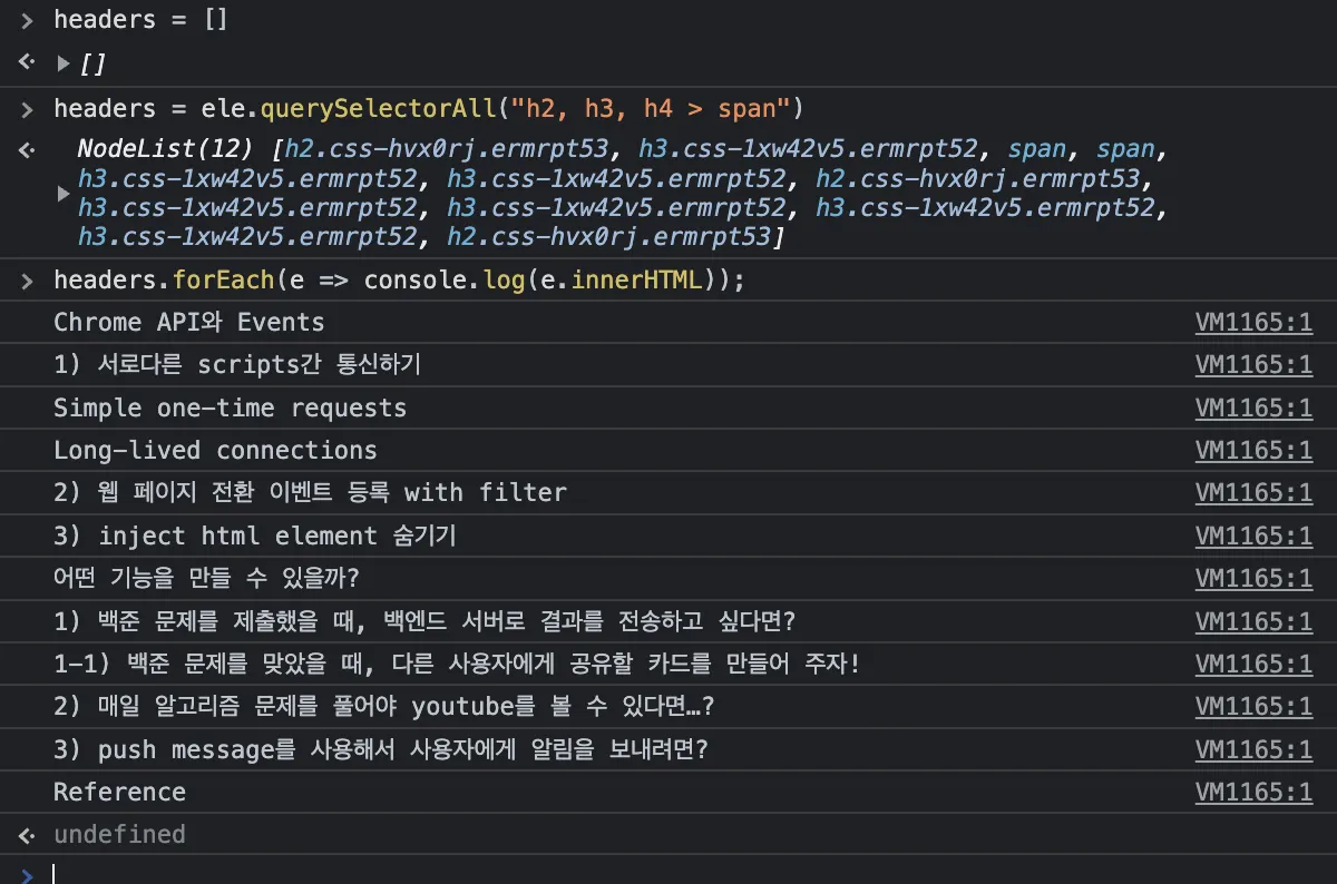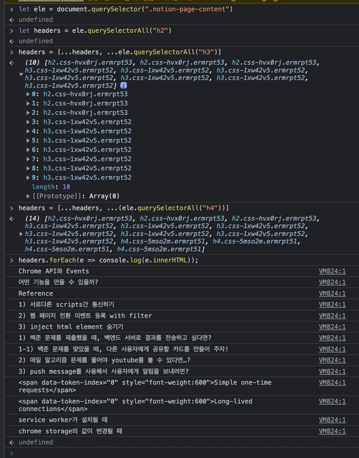 하지만 문제가 발생했다. 이렇게 하니 목차의 순서가 유지되지 않았다. 처음에 h2를 모두 가져오고 h3를 가져오다보니 h2의 자식 h3를 바로 뒤에 가져오지 않았다. querySelectorAll()에서 or condition을 사용하면 해결 할 수 있을 것 같아 사용해보았다. 이제 원하는 결과를 출력할 수 있었다.