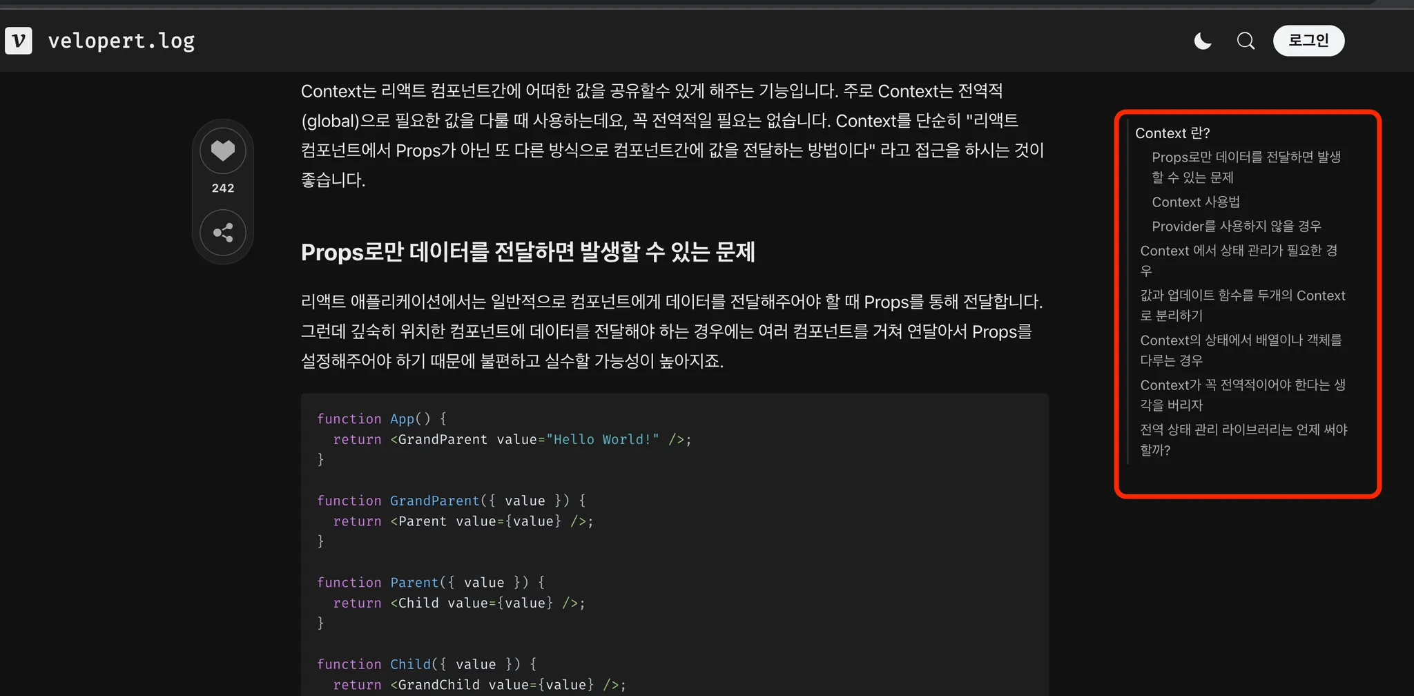 velog등 다른 블로그 서비스들은 목차를 오른쪽에 항상 띄워준다. 출처 : velopert velog