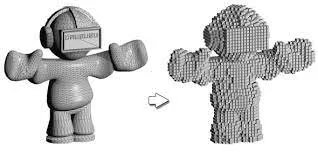 2차원에서는 픽셀처럼 일정 단위로 이미지를 구성하는게 일반적인 반면, 3차원 모델의 구성에는 2차원의 벡터와 유사한 폴리곤 방식이 주로 사용됩니다. 2차원 상에서는 지속적으로 컴퓨터가 연산을 수행해야하는 벡터방식보다는 2차원 배열에 RGB값을 담고 각 요소를 연산하는게 오히려 빨랐지만, 3차원 공간에서는 너무 많은 수의 원소를 계산해야하기 때문에 대체로 폴리곤을 통해 삼각형, 혹은 사각형 면들의 집합으로 형태를 구성하는 방식을 주로 사용합니다. 하지만 3차원 공간상에서도 2차원 처럼 단위 정육면체를 통한 형태 구성방식이 있습니다. 이를 볼륨(Volume)과 픽셀(Pixel)을 합쳐 복셀(Voxel)이라고 부릅니다. 부피를 가진 픽셀이라고 볼 수 있습니다.