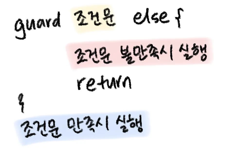 guard의 else문에서는 return(혹은 break, continue, throw)으로 즉시 종료시킨다.