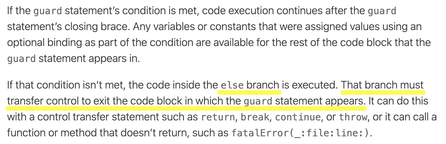 그러면서 guard의 else문(조건이 만족되지 않았을 때 실행됨)은 guard가 있는 코드블록을 return, break, continue, throw를 이용해서 즉시 exit시켜야 한다고 강조한다. 리턴을 하지 않는 fatalError(_:file:line:)를 이용해 exit시킬 수도 있다고 한다.