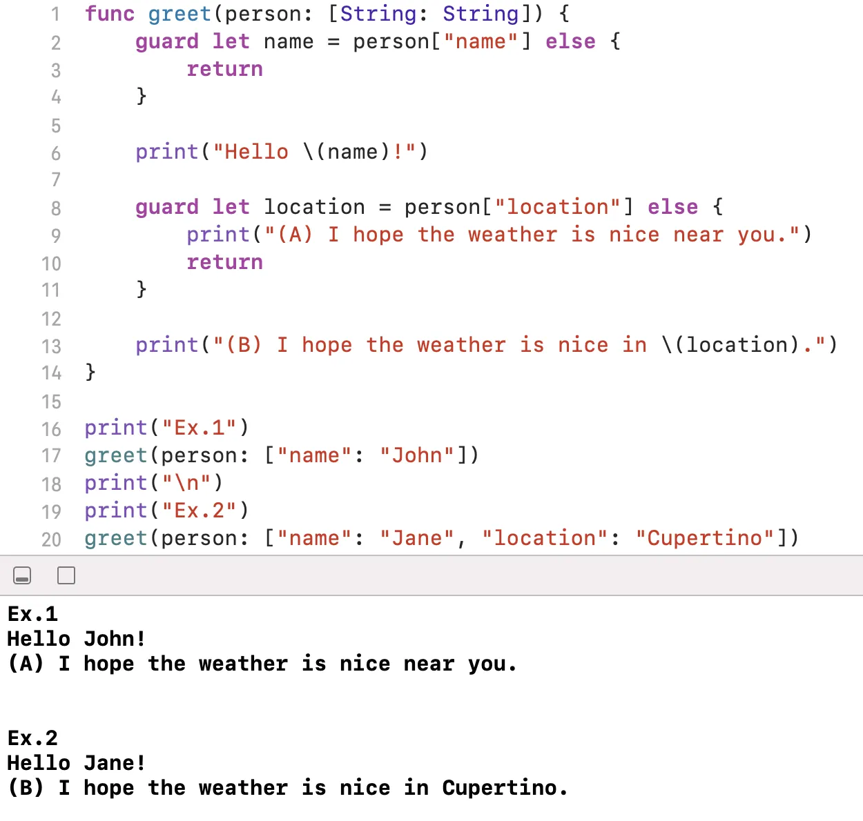 19번째 줄 Ex.2에서는 name도 존재하고(2번째 줄의 guard 조건문 만족O) location도 존재하기 때문에(8번째 줄의 guard 조건문 만족O) else문을 뛰어넘어 문장 (B) I hope the weather is nice in Cupertino. 가 출력되었다.