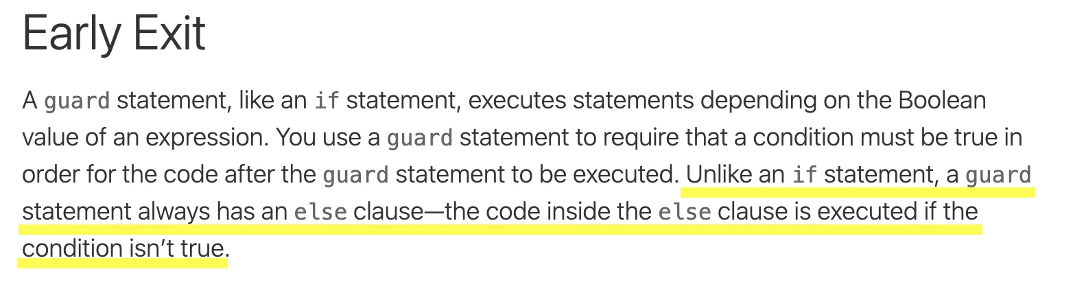 스위프트 공식 문서를 살펴보면 guard 와 if 의 차이를 guard는 항상 else문을 갖는 것이라고 설명한다.