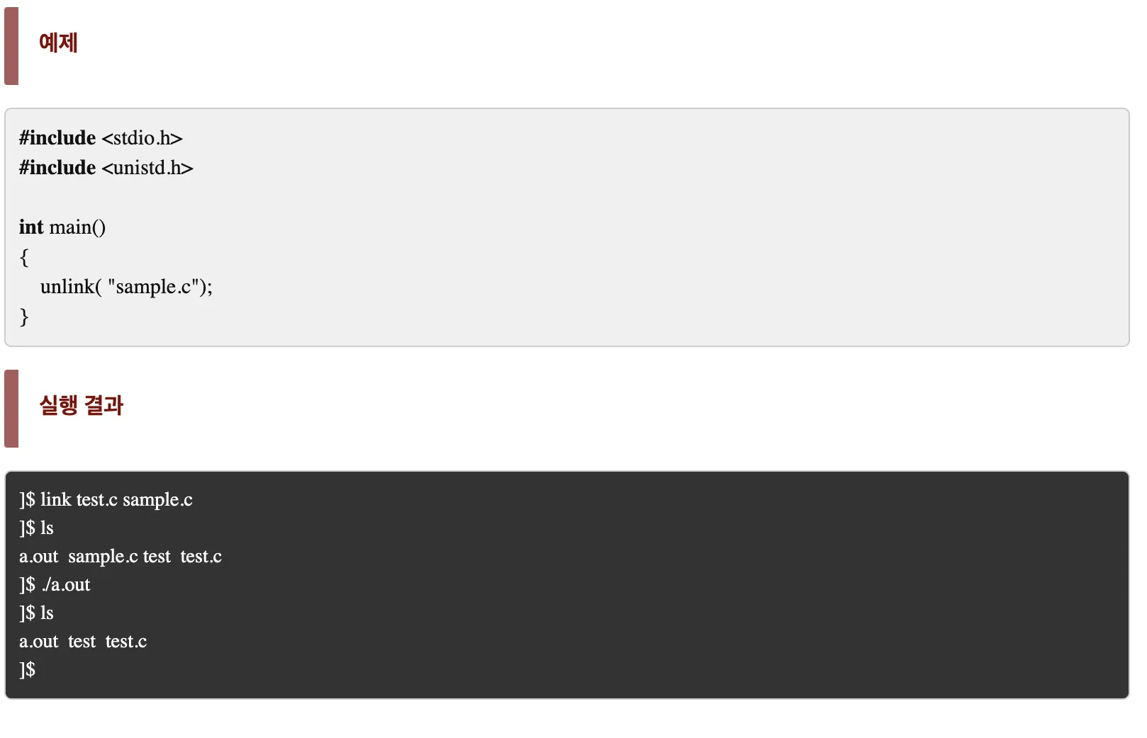 시스템 호출을 사용하여, 파일에 대한 디렉토리 항목을 지우고 링크 개수를 감소시킴.