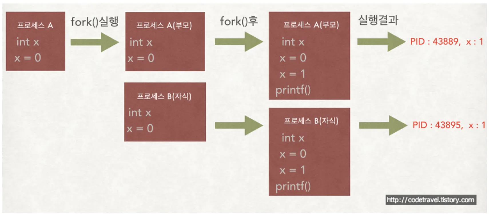 반환값 : 부모 프로세스는 자식프로세스의 PID, 자식 프로세스에겐 0 반환