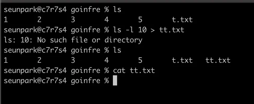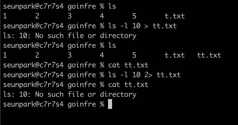 ls -l 10 2> tt.txt로 에러문구를 저장할 수 있다.
