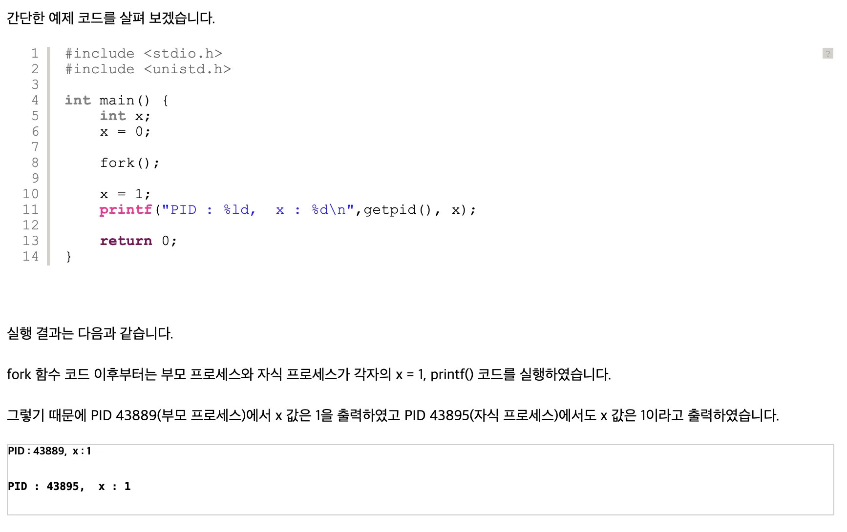 fork함수에 의해 생성된 자식 프로세스는 부모 프로세스의 메모리를 그대로 복사하여 가짐.