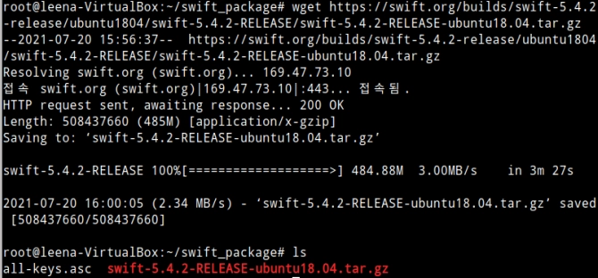 wget을 사용하여 ubuntu 18.04 에 해당하는 swift 5.4.2 를 download 한다.