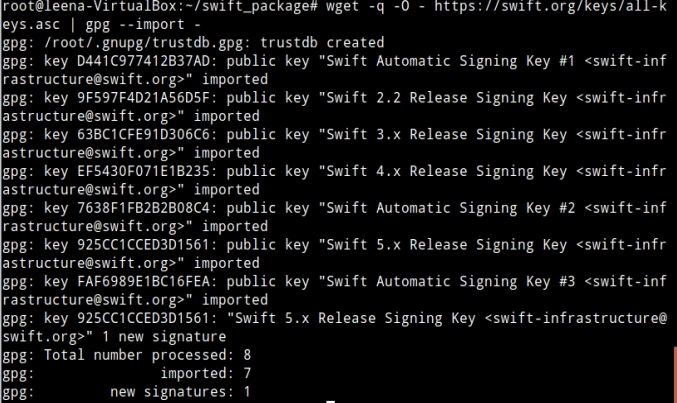 $ wget -q -O - https://swift.org/keys/all-keys.asc | gpg --import -