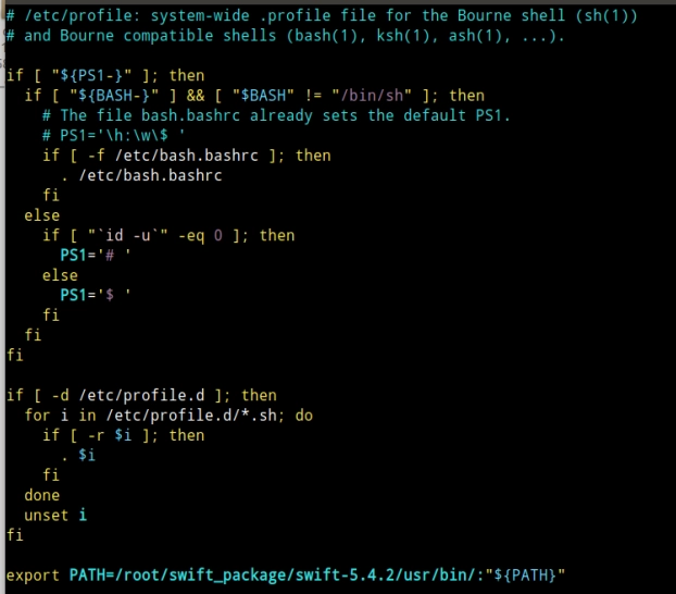 아래와 같이 /etc/profile 파일의 맨 밑에 export PATH=/root/swift_package/swift-5.4.2/usr/bin/:"{PATH}" 명령어를 넣어두면 앞으로 swift 를 항상 사용할 수 있게 된다.
