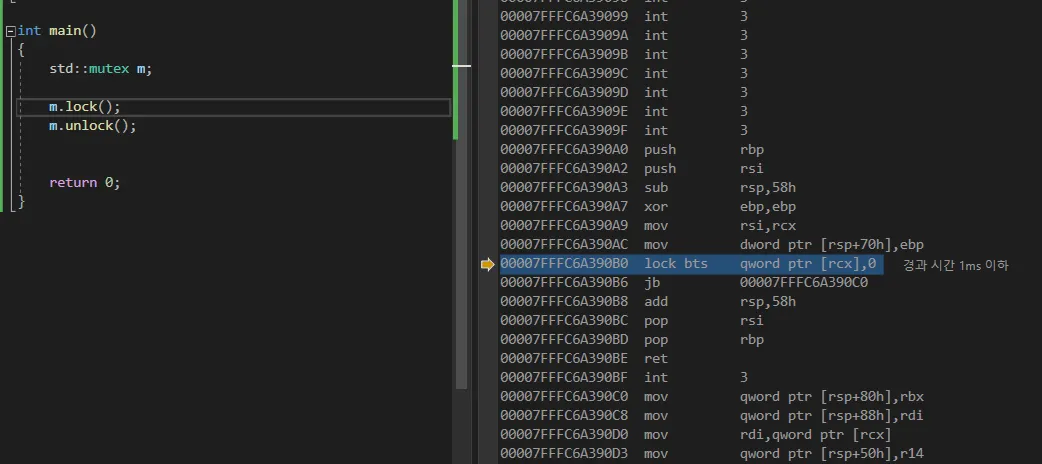 msvc의 std::mutex를 뜯어보면 안엔 lock bts (bit test and set) 이 있다.