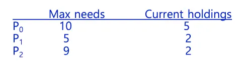 사용 가능한 자원은 총 12개, 3개의 프로세스가 존재하며, 9개의 자원은 아래 표와 같이 할당되었을 때 아래 표의 안전 상태를 점검해보자.