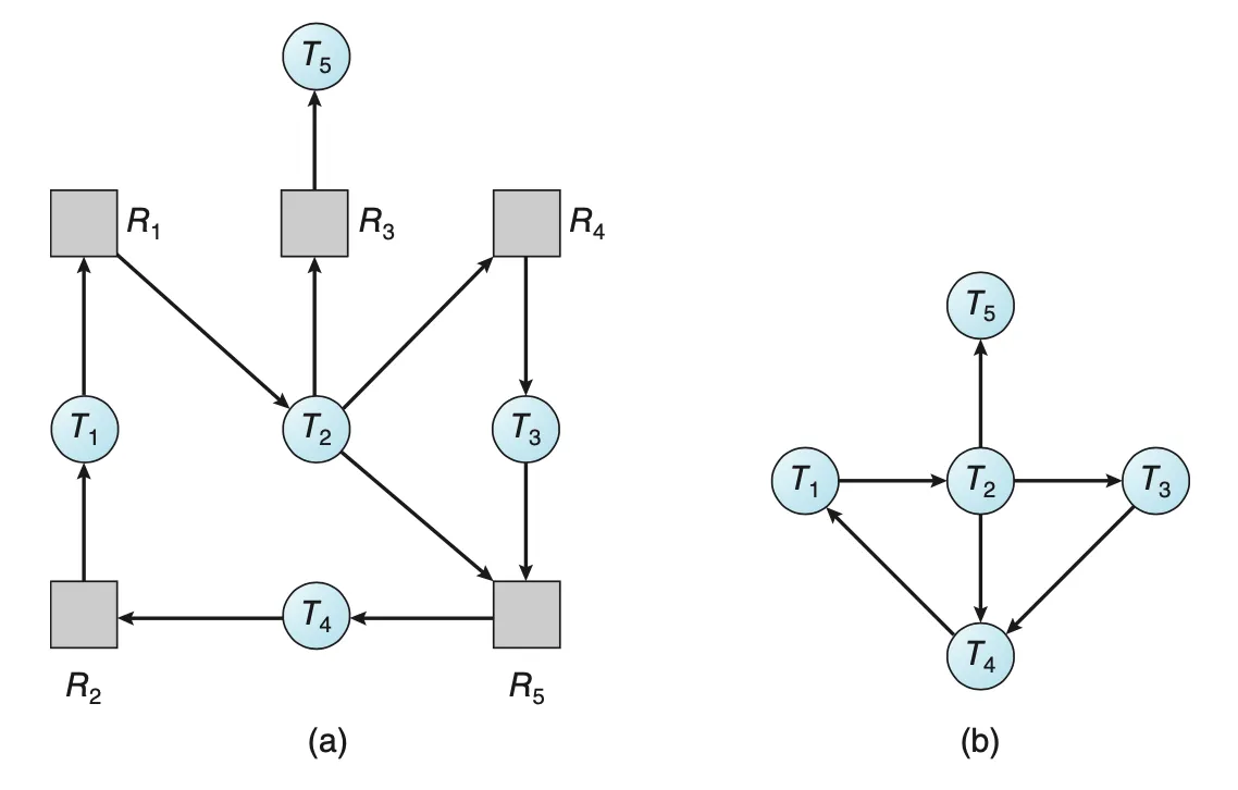 대기 그래프 사용. 자원 할당 그래프에서 자원을 없애고 얻을 수 있음.