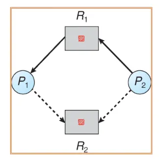 위와 같은 상황에서, 점선이 없다면 위 상태는 safe하다. P1이 R1을 해제하면 P2가 R1을 사용할 수 있기 때문이다.