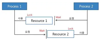 둘 이상의 프로세스 혹은 스레드(작업)들이 서로 상대방이 사용중인 자원을 쓰기 위해 대기하고 있는 상황.