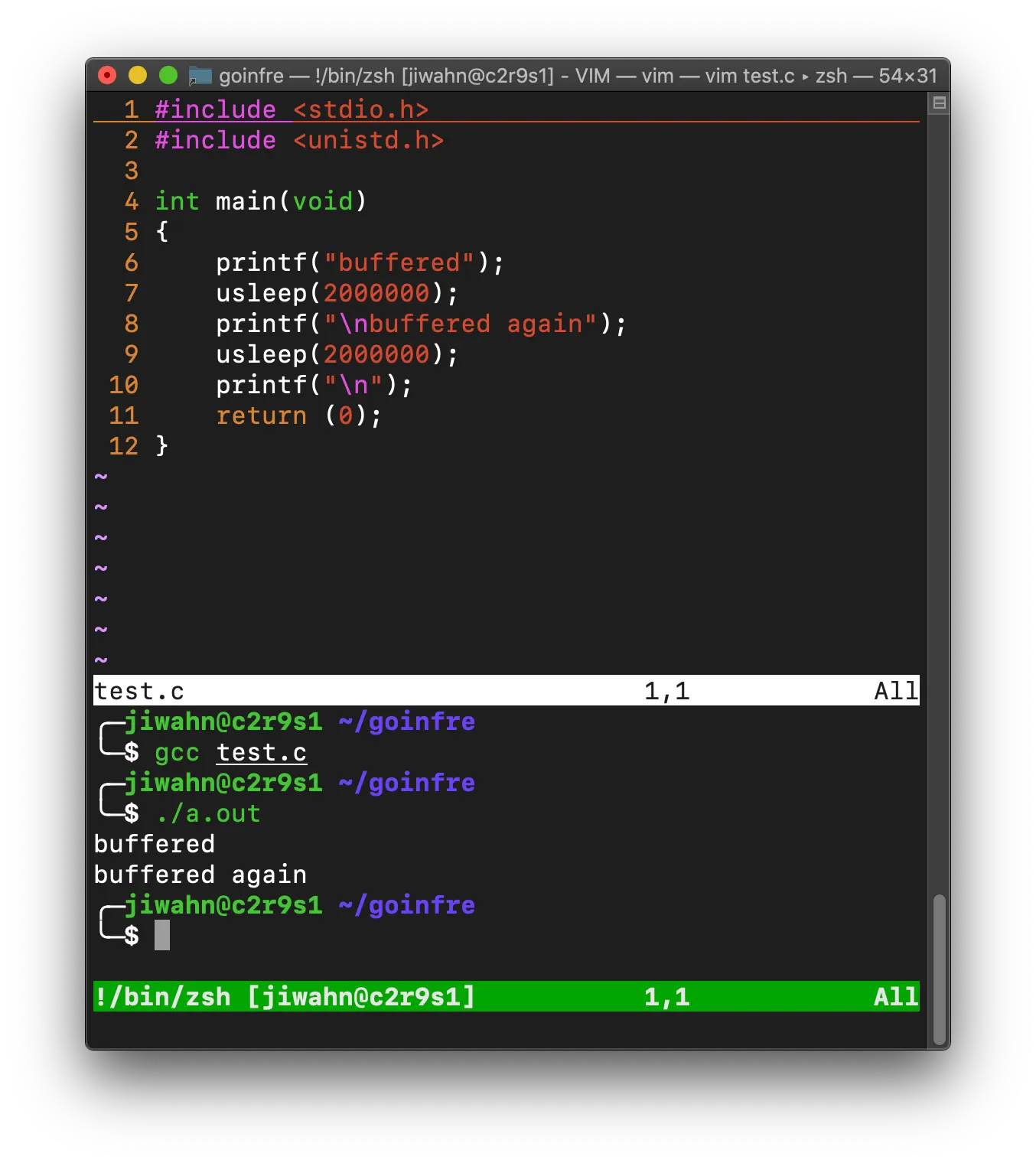 실제론 실행결과의 첫 줄과 아래 줄이 출력되기까지 usleep(2000000)만큼의 기다림이 있었던 거죠.