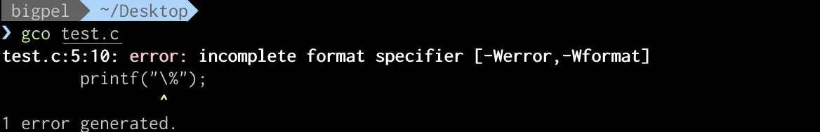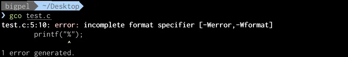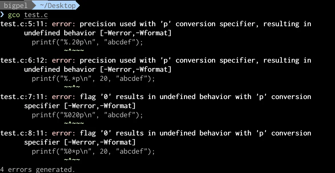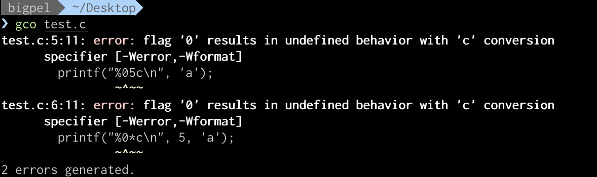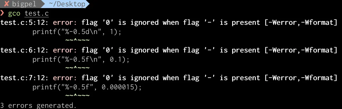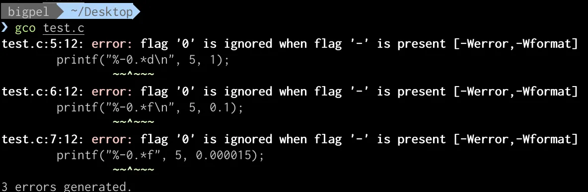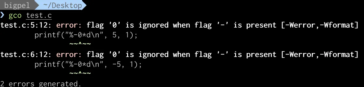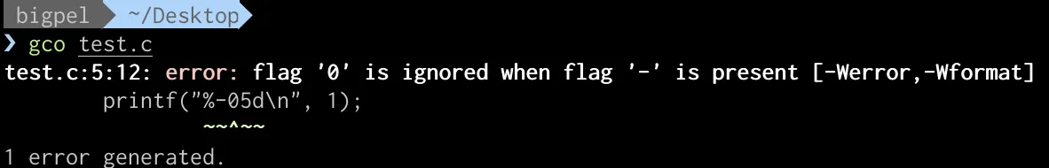 -0.p와 같이 flag에서 -와 0이 함께 사용될 수 없기 때문에 아래와 같이 컴파일 경고가 발생한다.