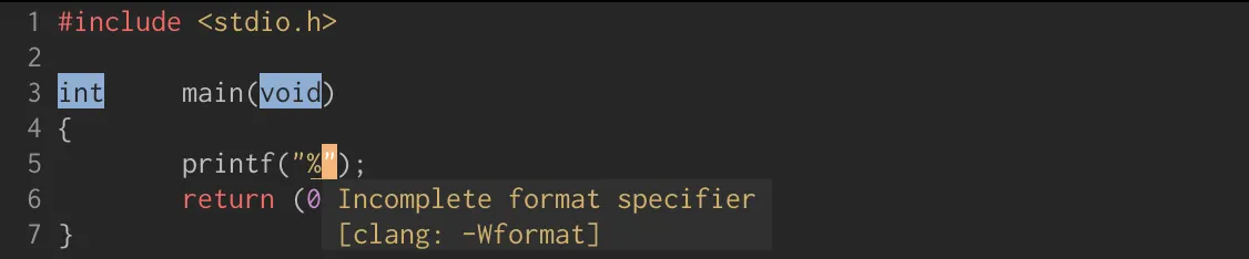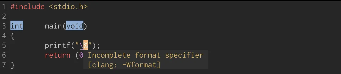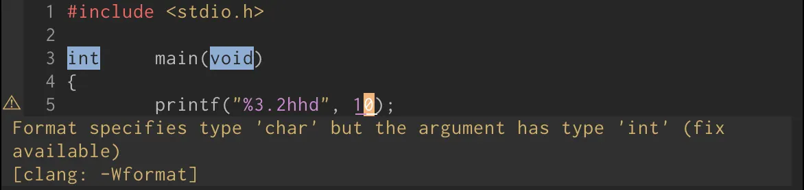 type 필드의 d 옵션 앞에 hh라는 length 옵션이 붙으면 signed char로 인식하게 된다. 하지만 signed char 범위 내에 있는 값을 printf의 가변 인자에 넣어주면 아래와 같이 경고가 발생하는 것을 알 수 있다. (컴파일 시 경고 허용을 하지 않으면 컴파일이 되지 않는다.)