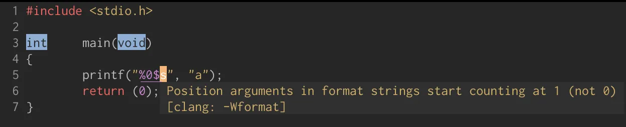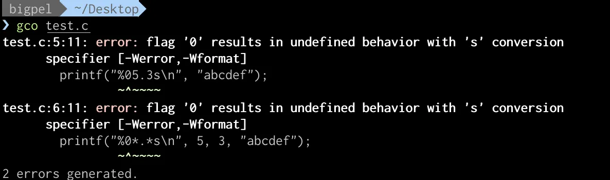 0 > * : 인자로 받은 *에 대해 너비가 *이 되도록 빈 자리에 대해 0을 오른쪽에 추가해야할 것 같지만, 인자로 받은 *이 음수라면 flag의 -옵션이 적용된다. flag의 -와 0은 함께 사용할 수 없으므로 -w와 같은 결과로 출력된다. -0w처럼 컴파일 경고를 주지 않는 이유는 코드 상에 w를 명시해놓은 것이 아니고 런 타임에 사용자로부터 입력을 받도록 만들었기 때문이다. 런 타임에 발생한 케이스는 컴파일 타임에서 찾아낼 수 없다.