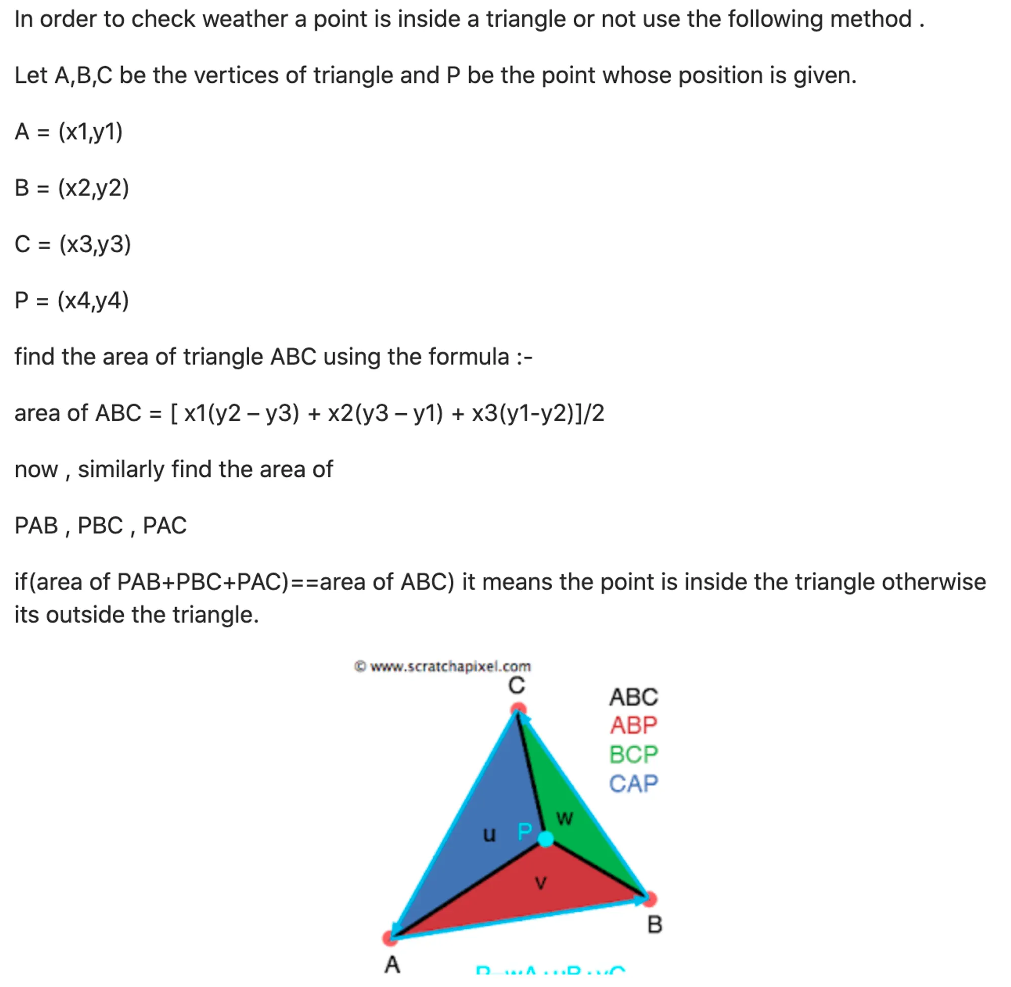 위 글을 읽으셨다면 글 중간에 언급된, clockwise를 보셨을 것입니다. 이 부분에 대해 생각해보면, 연결되어 있는 변에 대해서 만약 점과 그 변이 이루는 각이 모두 시계방향이거나, 모두 반시계방향이면 그 도형 내부에 점이 있다고 생각할 수 있습니다. 물론 각이 0이 된다면 이는 도형 내부가 아닌 변 위에 혹은 외부에 있다고 생각이 가능합니다. 이러한 것들을 봤을 때, 우리는 바로 이전에 배운 외적으로 그 각이 시계방향인지, 반시계방향인지 알 수 있게 됩니다. 삼각형의 경우를 생각하겠습니다.