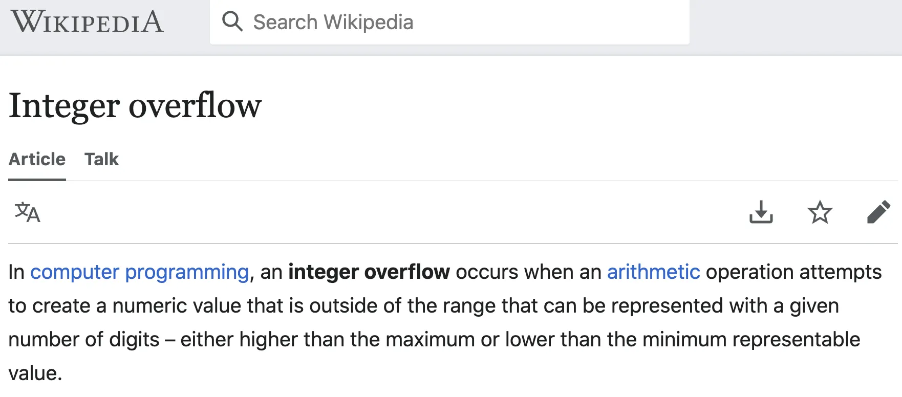 번역 : 컴퓨터 프로그래밍에서 integer overflow란? 표현할 수 있는 범위를 벗어난(최대값보다 높거나, 최소값보다 낮은) 숫자값을 만들어내는 산술 연산이 시도될 때 발생한다.