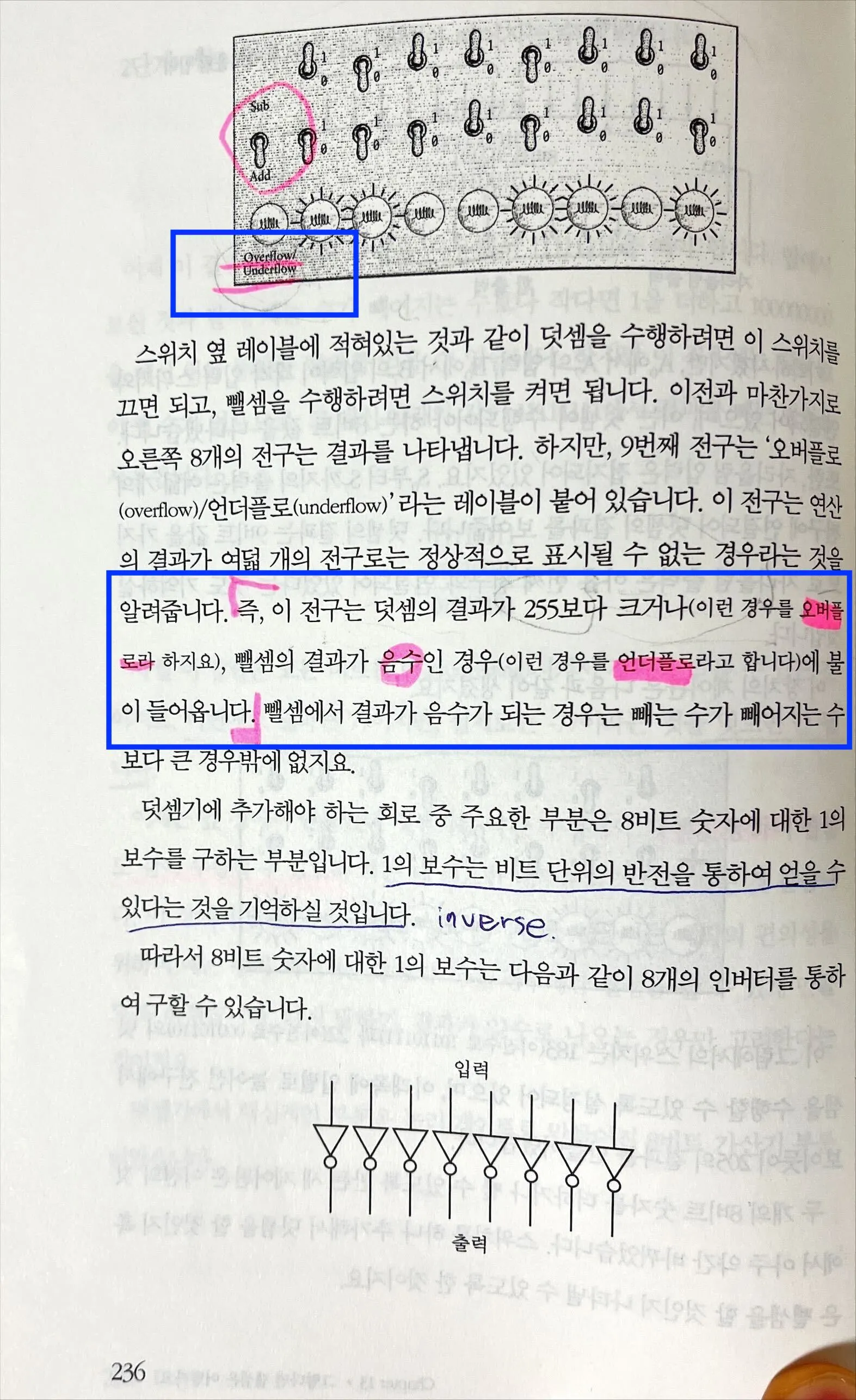 찰스 펫졸드의 저서 CODE의 236쪽. 상단의 삽화에 overflow 이거나 underflow인 경우 불이 켜지는 전구 그림이 있다. 본문 중단에는 8비트 가산기의 계산 결과가 표현할 수 있는 범위의 최대값인 255보다 크면 overflow, 0보다 작으면 underflow라고 기술돼 있다.