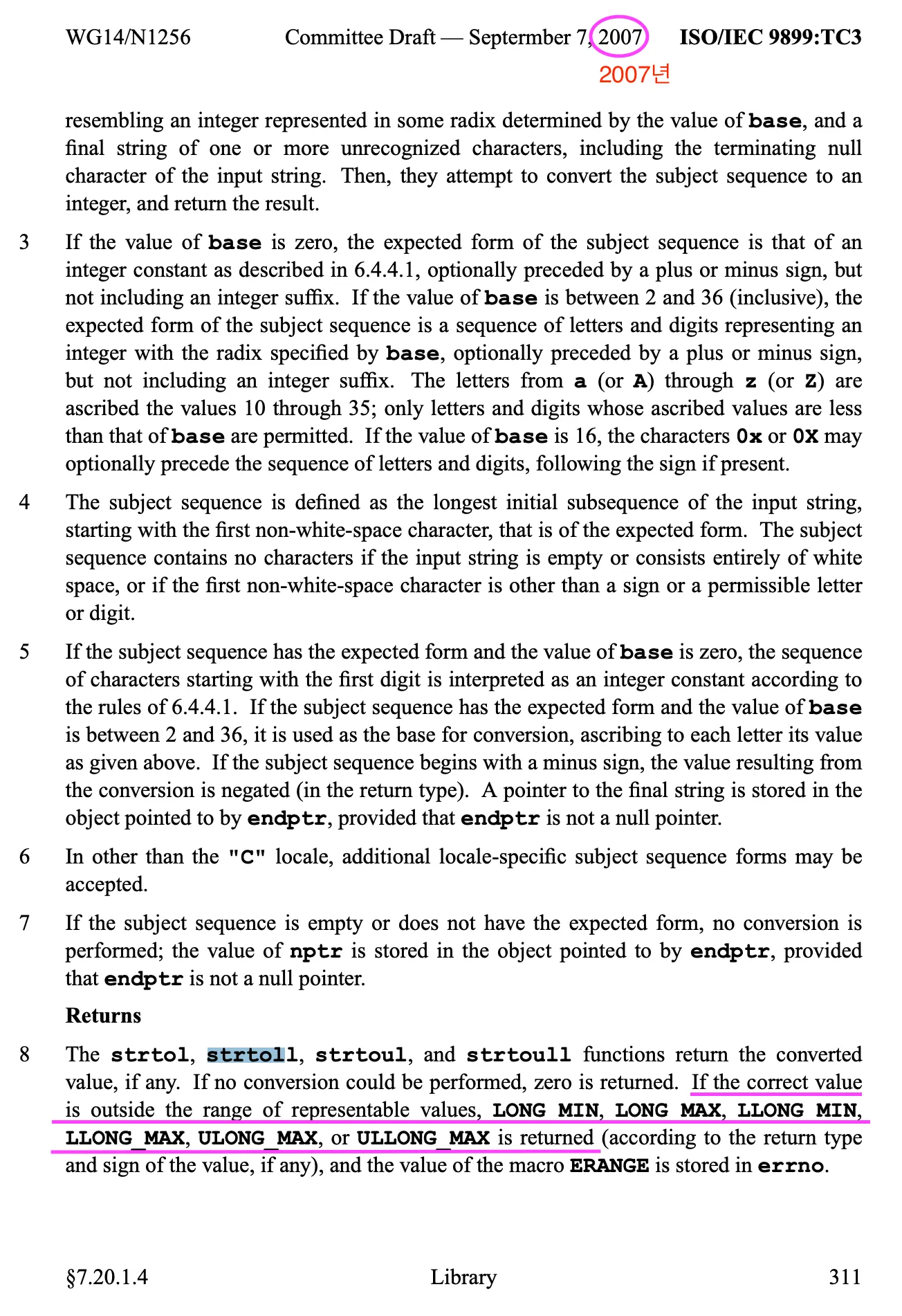 정정 근거 2) C표준 2007년, 2014년 개정판의 함수 strtol과 함수 strtoll의 매뉴얼