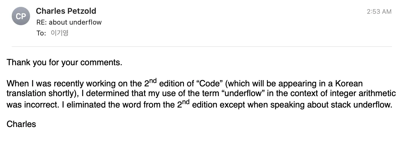 그래서 펫졸드에게 이메일로 물었고, 감사하게도 그가 다음과 같이 실수를 인정하는 회신을 보내왔다. (정정)→ ‘본 회신을 저자 펫졸드씨가 실수를 인정한 것이 아니라 CODE를 집필하고 출간한 1999년 즈음에는 integer에서도 underflow를 썼기 때문에 그땐 그렇게 썼던 것이고 이번 2023년 개정판에서는 바뀐 ISO C에 맞춰 해당 용어를 삭제했다는 회신을 보내온 것으로 정정합니다.’