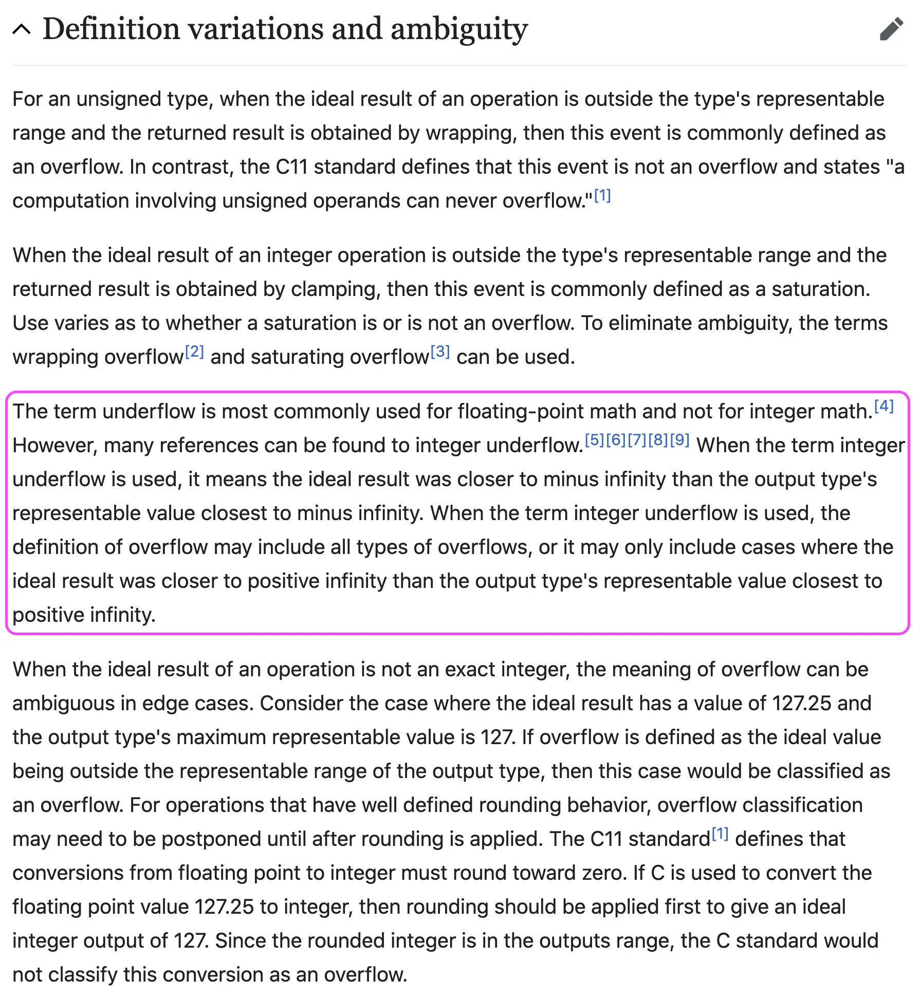 1999년 까지는 (그리고 2007년 이전 까지는) C표준에서 integer에서 연산 결과가 표현범위의 최소값 미만이 되면 underflow, 최대값을 초과하면 overflow라고 했다.