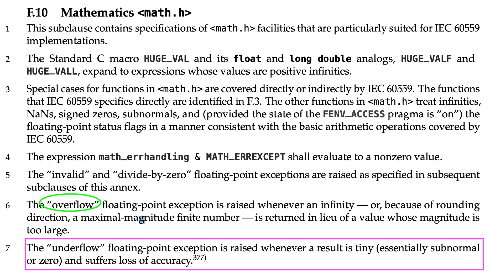 그러나 C표준이 개정을 거듭하면서 2000년대 초반 언젠가(2007년 이전)에 integer에서 underflow 개념이 사라진다. integer에서 연산 결과가 표현범위의 최소값 미만이 되면 underflow, 최대값을 초과하면 overflow 라는 표현을 삭제하고, 단순하게 표현범위를 벗어나면 overflow라고 바꾸어 정의했다.