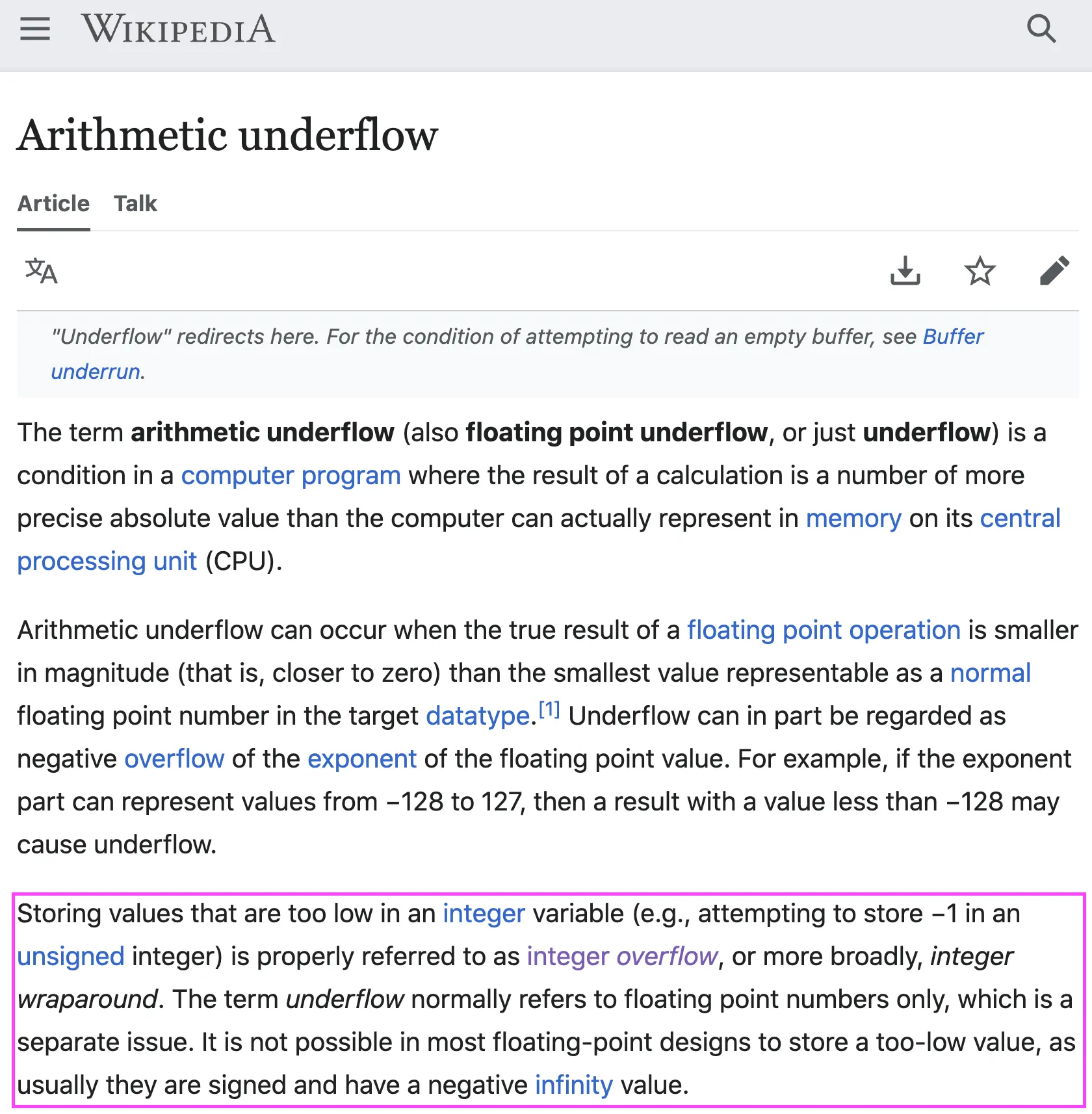 [하이라이트 번역] 정수형 변수가 표현할 수 있는 가장 작은 숫자보다 작은 숫자를 할당하는 행위(예: unsigned int형 변수에 -1을 할당하는 경우)를 overflow 또는 폭넓게는 integer wraparound라고 한다. underflow라는 용어는 보통 부동소수점 숫자를 언급할때만 쓰인다. 부동소수점 designs에서 그것이 부호화되거나 음의 무한대값을 갖는것처럼 너무 낮은 값을 저장하는 것은 불가능하다.