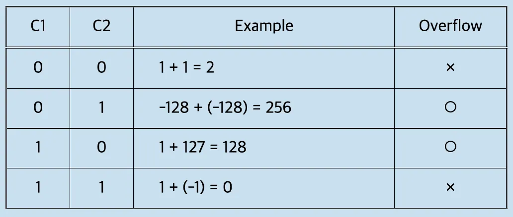 캐리 : 최상위 비트(MSB)에서 그 위의 비트로 자리올림이 발생하는 것. (캐리 자체로는 오류 발생과 관련 없음)