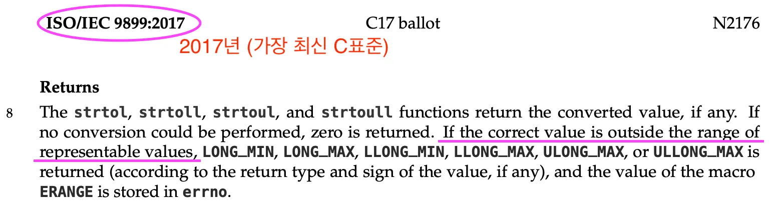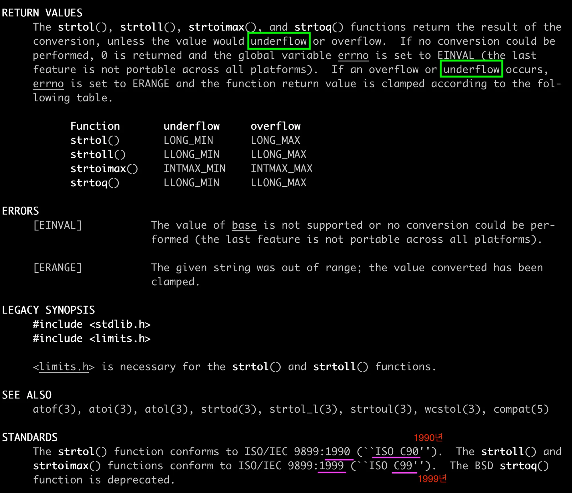 터미널에서 함수 strtol과 함수 strtoll 의 매뉴얼에 따르면 함수의 return값에 대한 설명에서 return값이 표현 범위의 최소값 미만이면 underflow, 최대값 초과면 overflow 라고 안내하고 있는데, 이는 각각 ISO/IEC 9899:1990 (``ISO C90'') (1990년 기준), ISO/IEC 9899:1999 (``ISO C99'') (1999년 기준)에 따름이라고 그 출처를 밝히고 있다.