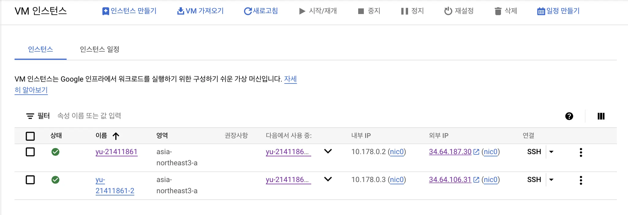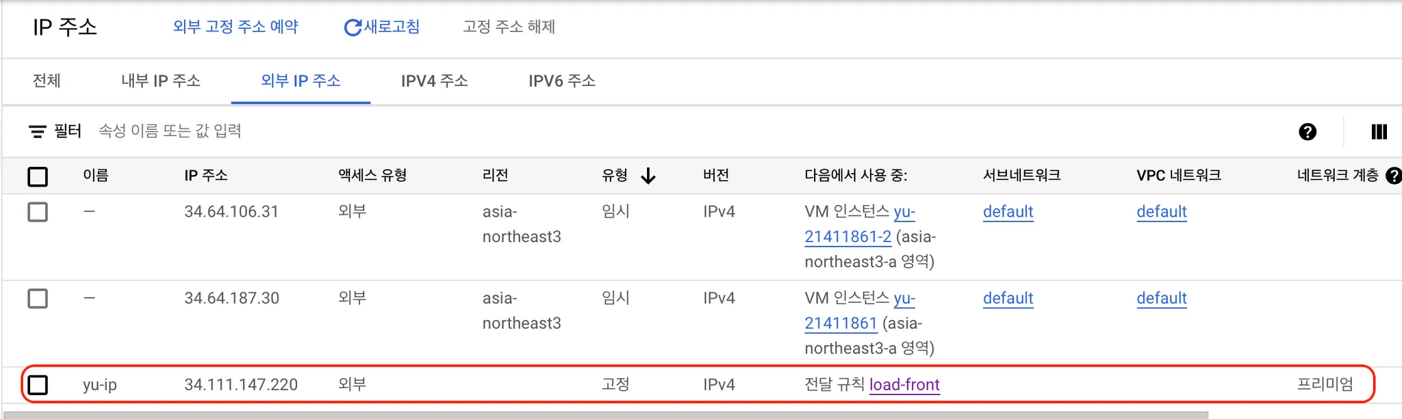 각 인스턴스는 이미 접속할 수 있는 고정 IP가 있지만, 부하분산기로 접속할 때 필요한 고정 IP는 따로 생성해주어야 한다. 미리 고정 IP를 생성해두면 편하기 때문에 고정 IP를 생성해두자.