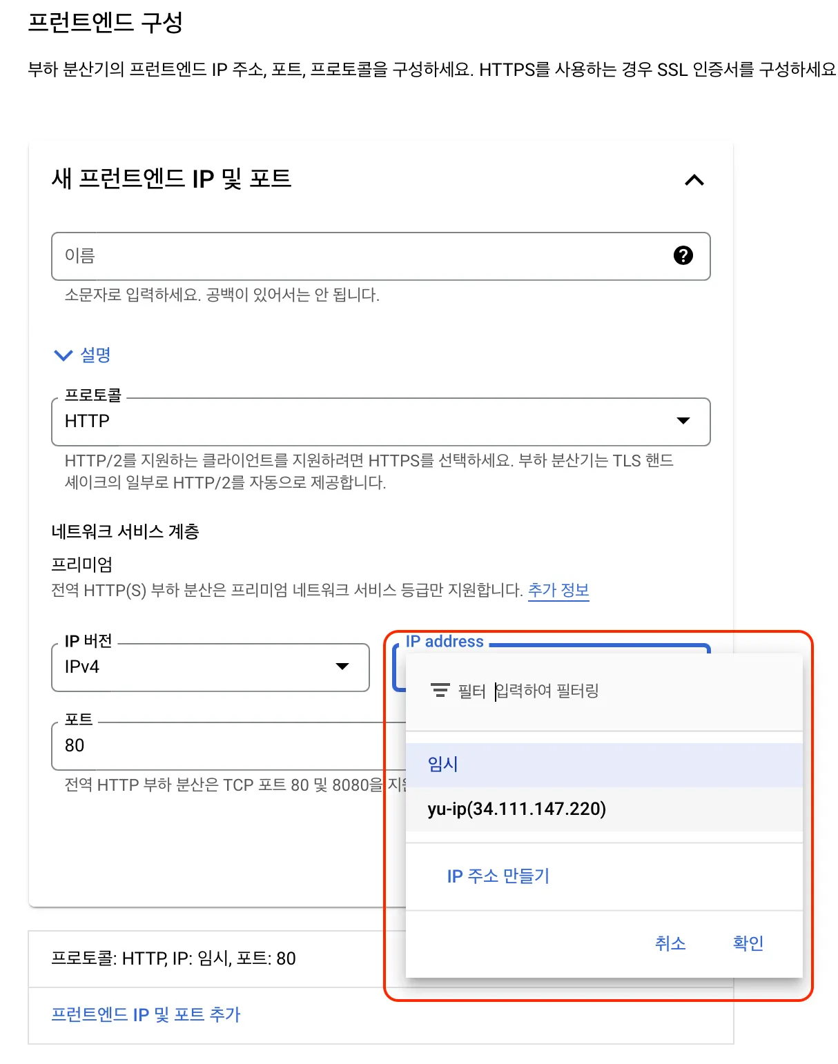프론트엔드 구성은 유저가 접속할 엔드포인트에 대한 구성이다. 이전에 만들어둔 고정 IP를 등록해서 엔드포인트 구성을 마무리한다. 백엔드 구성은 서버가 응답할 엔드포인트에 대한 구성이다. 인스턴스 그룹을 활용한 테스트를 진행할 것이기 때문에 인스턴스 그룹, 그리고 만들어둔 그룹을 선택한다.