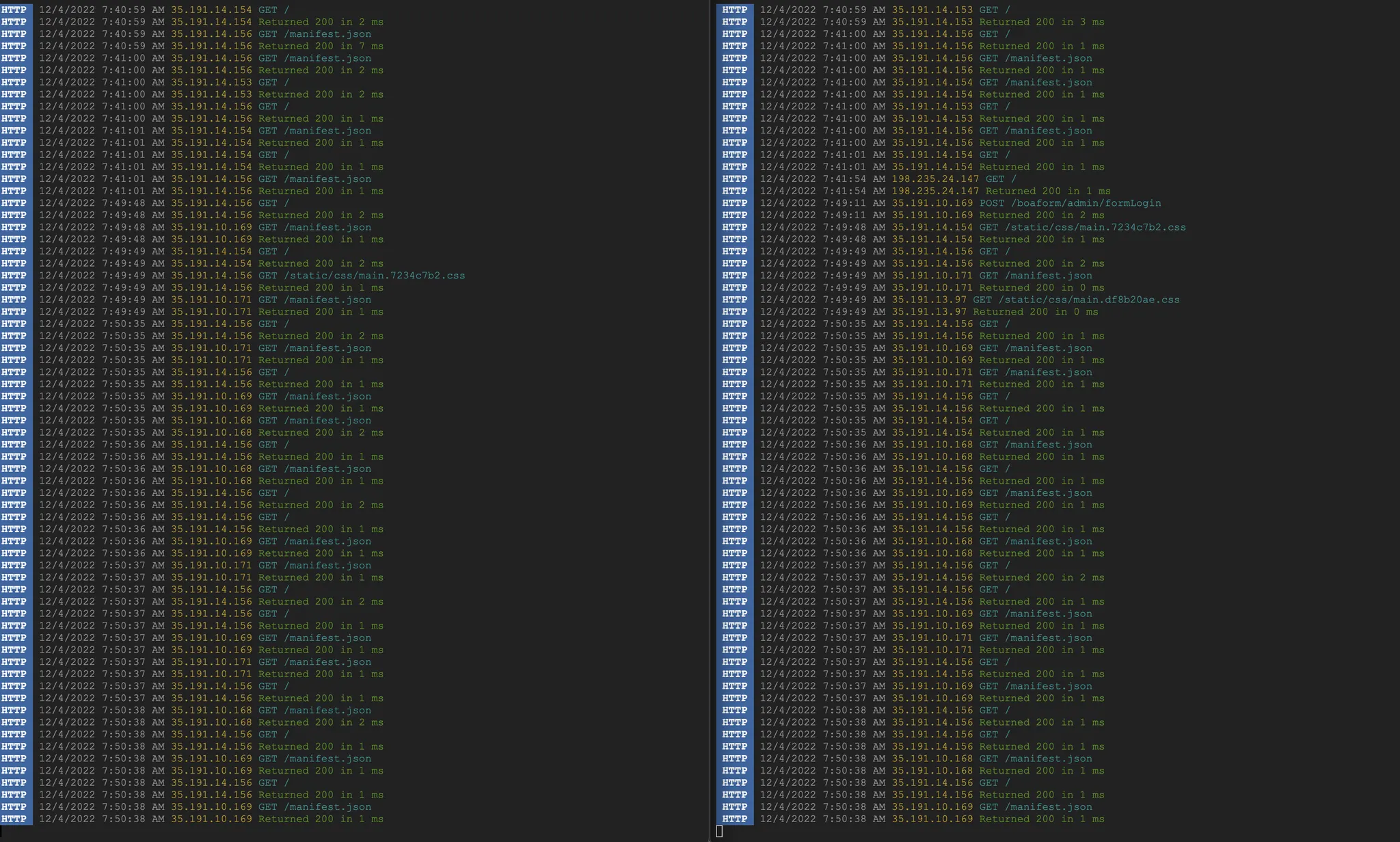 왼쪽은 첫번째 인스턴스 (id : yu-21411861) 오른쪽은 두번째 인스턴스(id: yu-21411861-2)에 들어온 요청이다. 부하분산기가 정상적으로 동작하고 있는 것을 로그를 통해 확인할 수 있다. 현재는 / 에 대한 요청밖에 없어서 큰 차이가 없지만, GET / → GET /logo.svg 와 같이 여러개의 요청이 들어온 경우, 서로 다른 인스턴스에서 각각 하나씩 맡아서 요청을 처리하고 응답을 보내주기도 한다. 즉, 로드벨런서는 실제로 사용자가 보낸 요청 뿐 만 아니라, 해당 요청이 참조하는 다른 요청들에 대해서도 부하분산을 해준다.