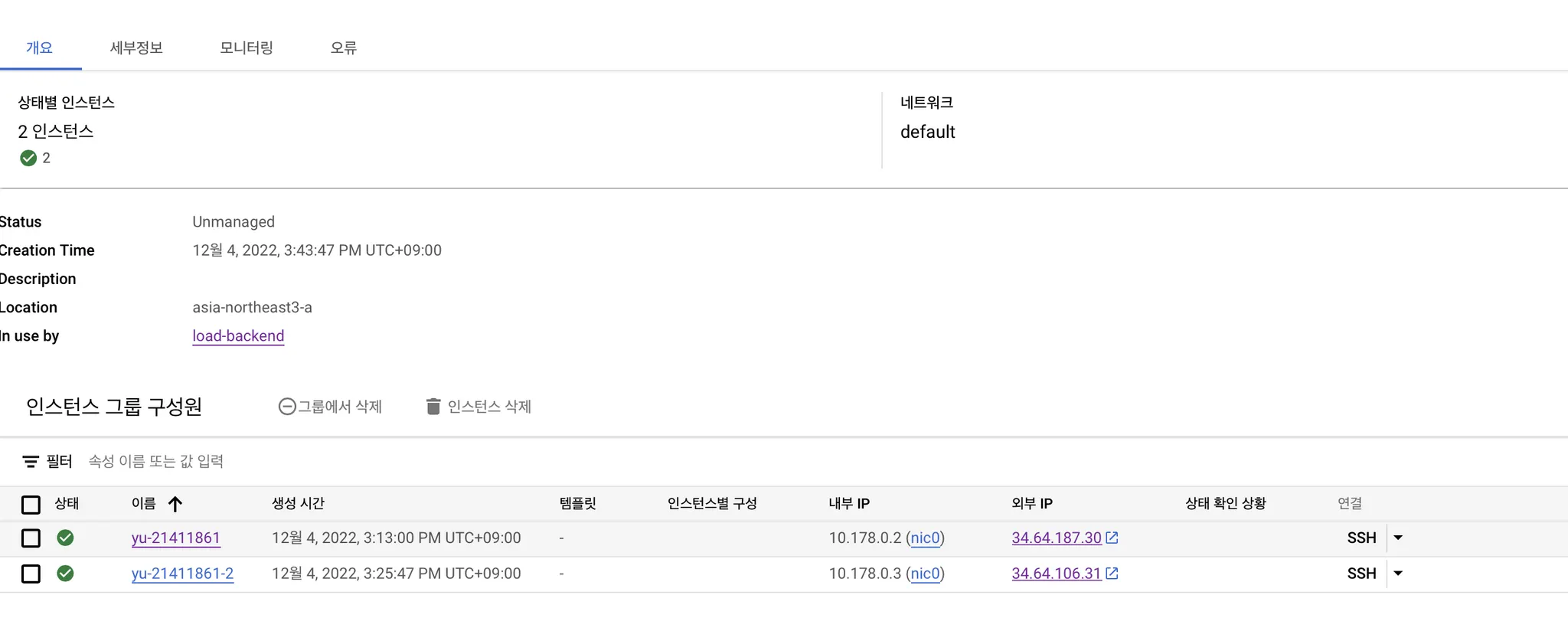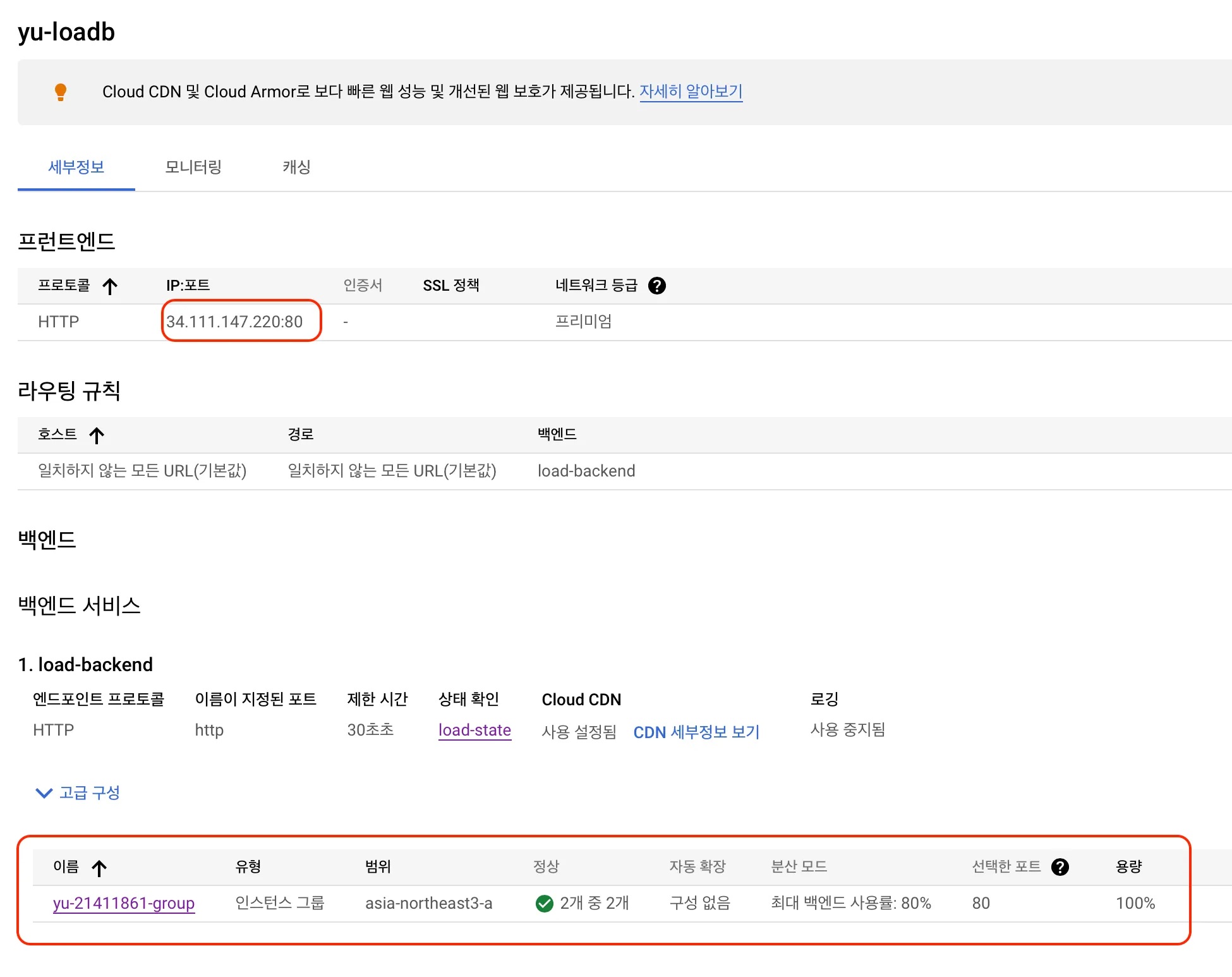 상세 정보에 들어가면 프론트엔드 접속 포트와 백엔드 인스턴스 그룹 구성, 그리고 해당 인스턴스들의 상태를 확인할 수 있다.