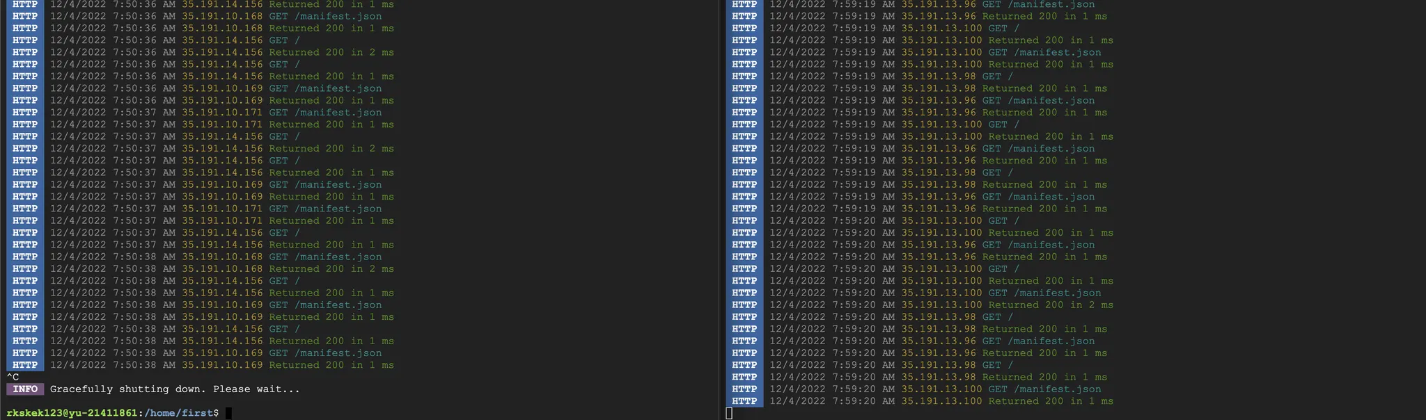 인스턴스 그룹에 2개의 인스턴스가 등록되어 있으나, 첫번째 인스턴스를 종료한다면 어떻게 될까? 확인해봤더니 응답 에러를 내보내는 것이 아니라 살아있는 end point의 응답만 보내준다. 아래 로그를 보면 왼쪽 인스턴스에 배포중인 서버를 종료한뒤 테스트를 진행했을 때, 오른쪽으로만 접속이 되는 것을 볼 수 있다. 이렇게 부하분산기를 운영하면, 서버가 부득이한 이유로 종료되거나 버전 업을 위해 잠시 배포를 중단한 상황에서도 실제 사용자는 정상적으로 서비스를 제공받을 수 있다.
