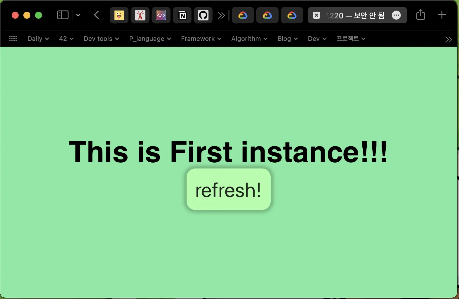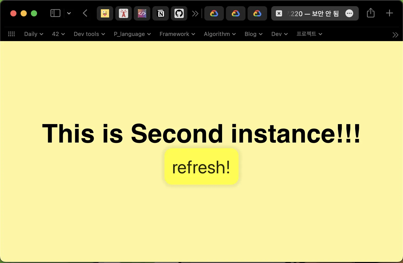 새로고침을 해서 새로운 요청이 갈 때마다, 부하분산기가 동작하는 것 을 확인할 수 있다. 아래 refresh 버튼을 누르거나 cmd + f5(브라우저 새로고침)을 눌러서 확인할 수 있다.