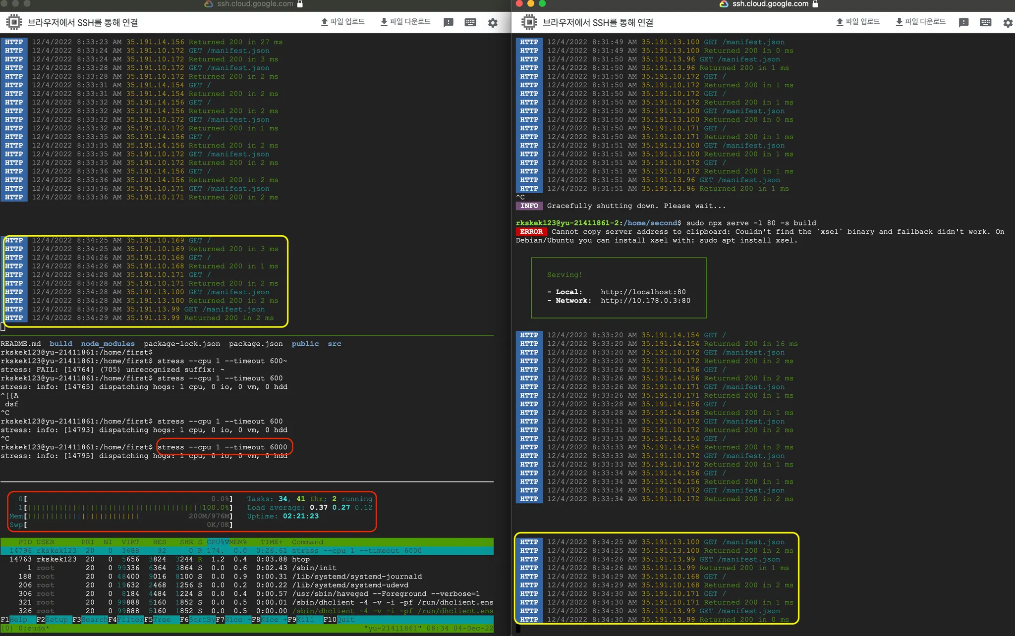 여기서 첫번째 인스턴스에 stress 명령을 활용해 cpu사용량을 100%로 올려보았다. 왼쪽 아래 htop을 보면 cpu사용량이 100%가 된 것을 확인할 수 있다. 그리고 다시 요청을 보내보았다.