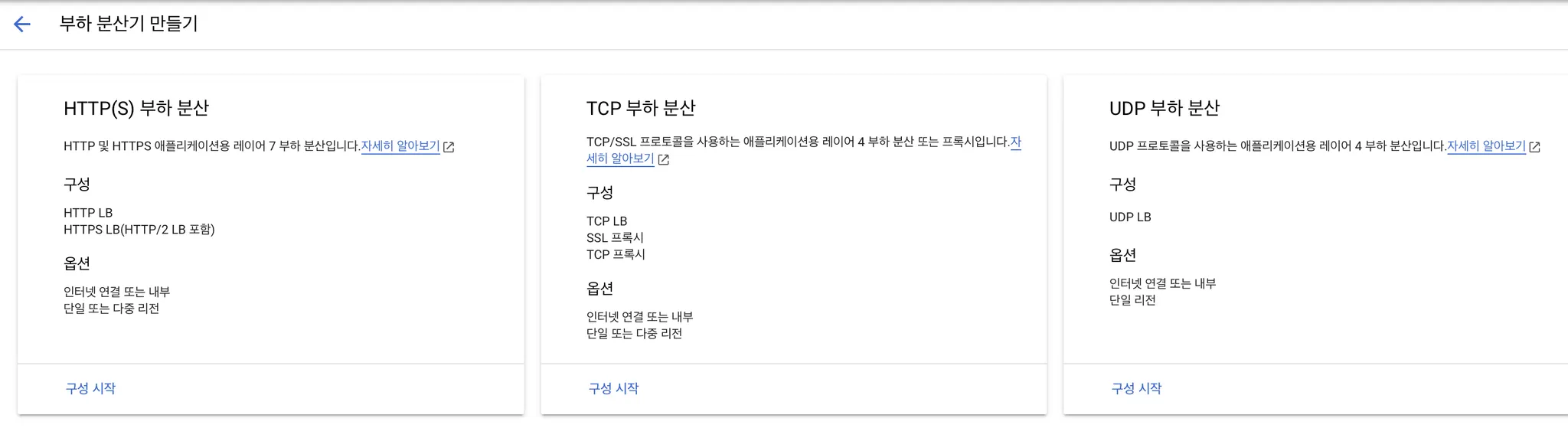 네트워크 솔루션 → 부하분산기 만들기에서 부하분산기를 생성한다. HTTP(S) 어플리케이션에 대해 만들 것이기 때문에 첫번째 구성으로 시작한다.