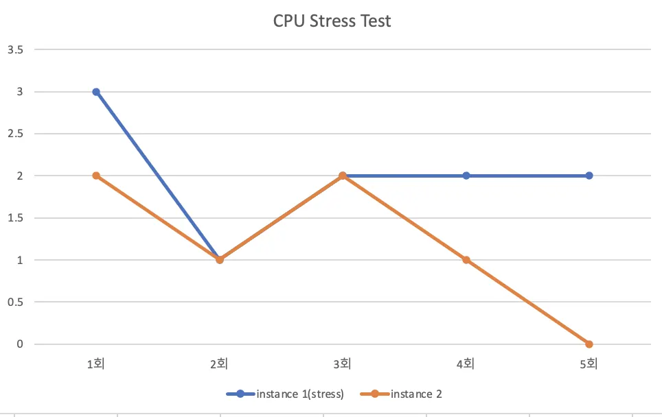 그런데 이러한 결과는 기대한 상황이 아니다. 하나의 인스턴스가 cpu사용량이 늘어나면 cpu사용량이 적은 인스턴스쪽으로 분산시키는 것을 기대했다. 아무래도 처리 속도가 너무 빨라서 분산까지 되는 상황을 측정하지 못한 것 같다.