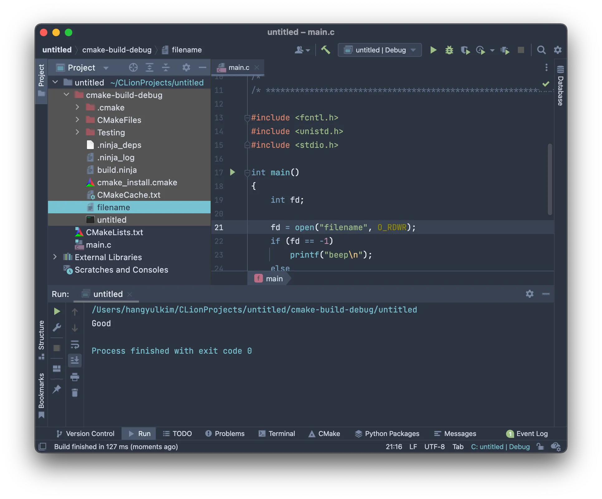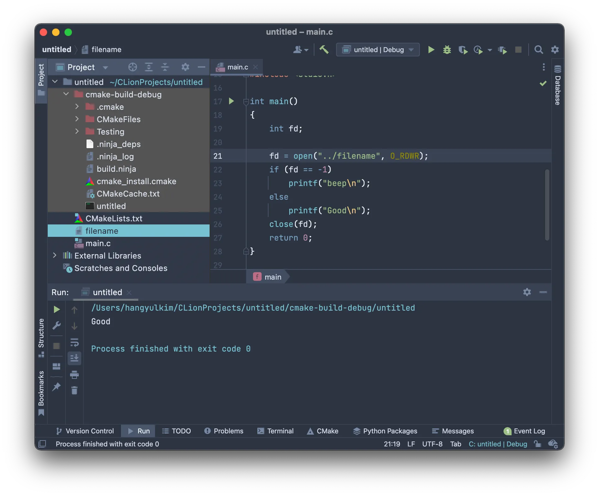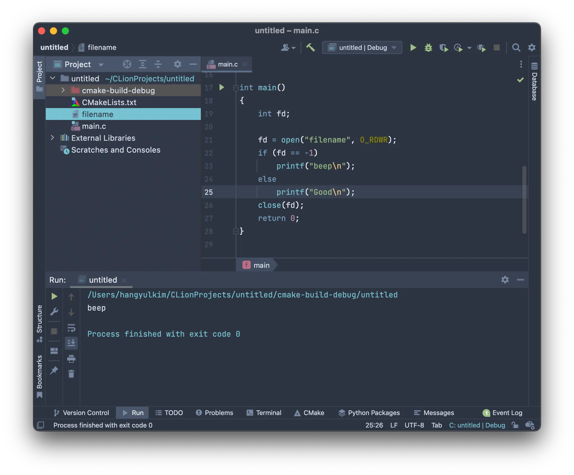그런데 CLion에서 프로젝트를 진행하다보면 위와 같은 방법으로 파일을 열었을 때 fd가 -1이 나오며 파일 열기에 실패하는 것을 볼 수 있는데요, CLion에서는 파일을 여는 위치가 다르기 때문입니다.